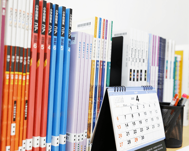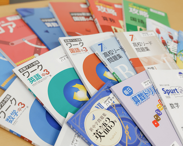 塾内には、学校の教科書や市販のワーク、その他塾専用の教材などが多数置いてあり、さまざまな教材にふれることができます。